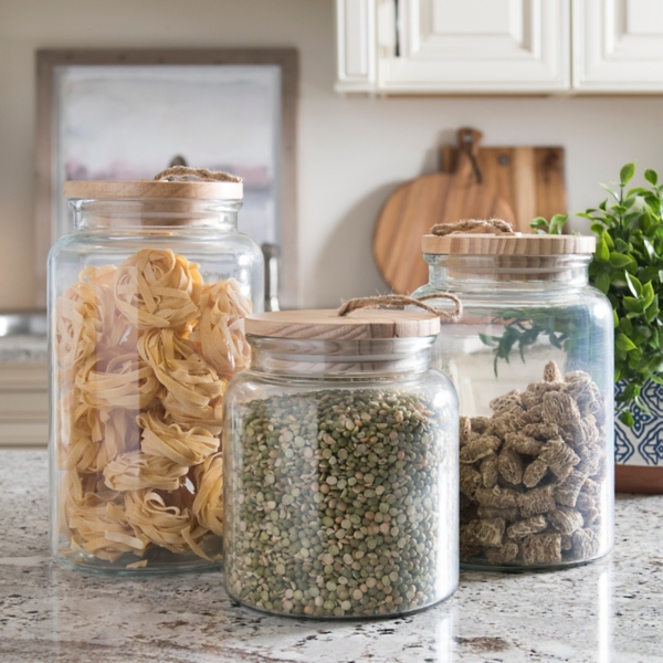 Use them to store food products and decorate the space with chic objects. Store tea coffee and sugar in these unique kitchen canisters. Featuring stylish wooden lids these canisters are perfect for a contemporary kitchen b m. Clear glass canister jar container set for food storage with airtight wood lid kitchen canister sealed glass containers wooden lids for loose tea coffee beans nut candy cookies 47 floz 2 piece set.