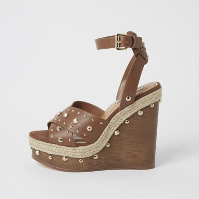 Clarks tan leather t strap wooden look wedge sandals size 5 5 uk. Tod s shoes brown leather wooden wedge heel sandals. Italian 40 us 10 conversion per designer s website. Steve madden kay studded caged wedge sandals in tan.